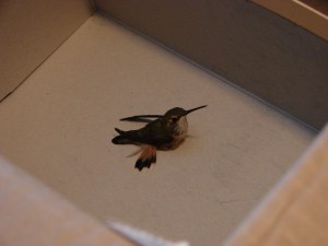 Last Sunday, while my husband was working in the yard, he save a little hummingbird from our cat “Paws”. The little guy had a broken wing, and we discovered that it was illegal for us to keep him, even if to nurse him back to health. Kevin named the little guy “snack” since he was nearly “Paws'” snack. Kevin took the little bird to a wildlife shelter and the lady there said that it would have to be euthanized. Apparently, for a hummingbird, eating coincides with flying. So even if a person caring for a hummingbird put a little birdfeeder in the box or cage with it, it wouldn’t know how to eat because it wouldn’t be able to fly. So it’s unnatural to just eat without the flying. We hated to see that he was going to have to be put to sleep, but it would be more painless than being crushed in the jaws of a cat.