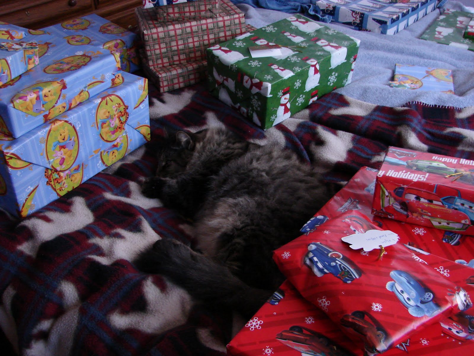 Um, yeah……….Well so much for “Wordless Wednesday”. I need to say a few words about this cat. I’d like to know what Oscar does that is so tiring that he needs to sleep all day………..on my bed. I know for certain, that he wasn’t spending hours wrapping these presents to tire him out.