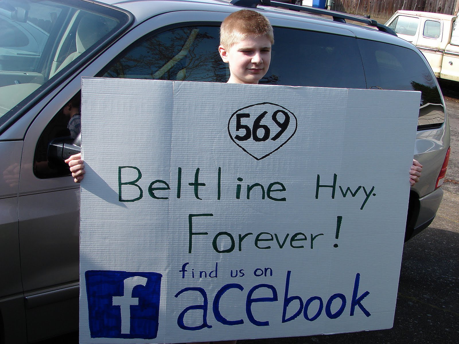 So, my husband, is a regular on Facebook and he created a page for those who were opposed to the name change and wanted to be a “fan”. The fan base grew rather quickly (and my husband brought in a co-admin for the page) and within one week, someone came up with the idea of staging a protest, standing on an overpass over this stretch of highway. So on a Saturday afternoon, probably 15 people (maybe more) showed up with signs (some of which my son made) and protested for a couple of hours (I didn’t go as I had told the kids that I would take them to a movie and I didn’t want to blow them off). Well this protest caught the attention of one of our local news stations, so that night, my husband was on TV. By this time, there were over 600 fans on the page. After this protest, there was talk of having another one at another area of this highway, on the following Monday (“Have fun storming the castle!”). Then on the following Friday & Saturday, there were protests again.
