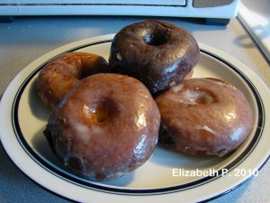 This morning, I woke up at around 6:30 (without the alarm, which has become the norm since I had the kids), and started rolling out the dough and then searching for something to cut out donuts with (which I don’t have so that means a shopping trip next payday). I finally used a drinking glass and the opening of a water bottle lid (improvising!). Then I laid the flat donuts on a wax covered cookie sheet and covered them. Because the dough had been in the refridgerator all night and I needed it to be warm and rising, I set the cookie sheet on the griddle and set it to “warm”. I put the donut holes on a plate, covered, and set it on the coffee pot which was at the time, making the coffee.