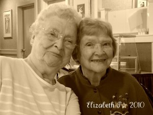 You know, there are many folks who believe in population control and that having just 2 kids is more than enough (however, if those two kids are of the same gender, then it’s ok to have more until you get the opposite), or if you have reached your 40’s, you should stop. Now if my great-grandparents had followed that logic, these two sweet and fun ladies wouldn’t be here (and neither would I for that matter). You see, they are the fifth and seventh out of seven children. Their parents started off with two children, a son and a daughter, and it was that way for about 10 years. Then suddenly, they started having children again and within a few years added five more. I think that there is 21 years between the oldest and the youngest. Aunt Bessie was 5 when she became an aunt for the first time. Over the years, all of the children married and had children of their own. . The cousins age range from the first to the last grandchild is about 40 years. Anyway, these days, my grandma and her sister are the two surviving siblings, and they are very special to us. Bessie starts her journey home tomorrow and I bet they’ll be talking on the phone on Sunday (or Saturday)