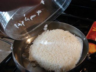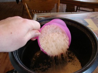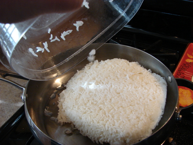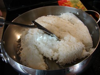 Before I start any chopping, I start cooking the rice. We bought this rice cooker a few years ago, and I think that it’s the most used appliance (other than my stove) in the kitchen. I use Jasmine rice, as it cooks really clean (in that there is absolutely no residue on the lid of the cooker when all is said and done). Once the rice is cooked, put it in an airtight container and let it chill in the refridgerator.