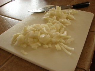 While the rice cooks, I move to the cutting board and start chopping the onion (I chop it first to get the crying over with). I generally use a medium white or yellow onion, and dice the whole thing.