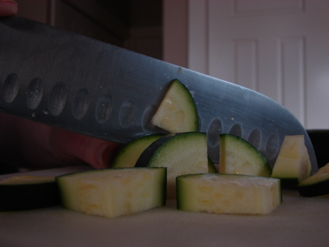 Next on the chopping block is the zucchini! A medium one seems to be enough for this recipe. I cut it in to quarters and then slice away!