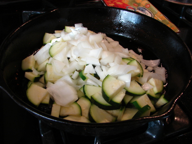 Then, add a little more oil to the pan and sauté the onions and zucchini!