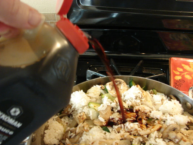 Now if anything starts sticking to the pan, this stuff here, this soy sauce, will loosen things up a bit and will make your stir fry more manageable (and it’s very tasty too). The amount of sauce depends on your taste, so as the cook, you get to taste test alot. If you have a “quality assurance” tester, such as a spouse……..even better!