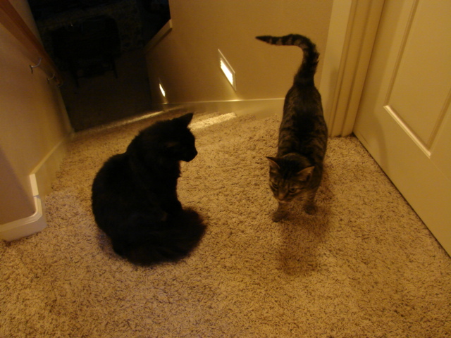 I hear a cat meowing at the door at around 6:15. So I get up and get ready to make coffee. However, at least one of these is waiting to greet me.