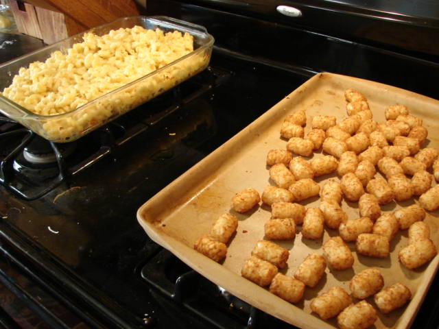 The requested birthday dinner: home made macaroni & cheese and tater tots. Starchy carbs all the way!!