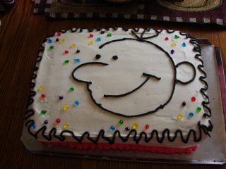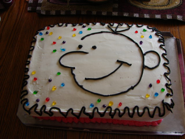 I could not have done this by myself. After I frosted the cake, my girl scored the Whimpy Kid face onto the cake and I piped the black frosting around it. It turned out very well!