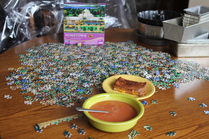 After breakfast, I figured that if my family is getting a day off, then I should be able to relax (within reason as some household chores still needed to be done). I like to put together puzzles. I had bought a puzzle a few weeks ago and now seemed like a good time to put it together. Then for lunch, the “wet-weather-cozy-food” menu called for tomato soup and grilled cheese sandwiches!