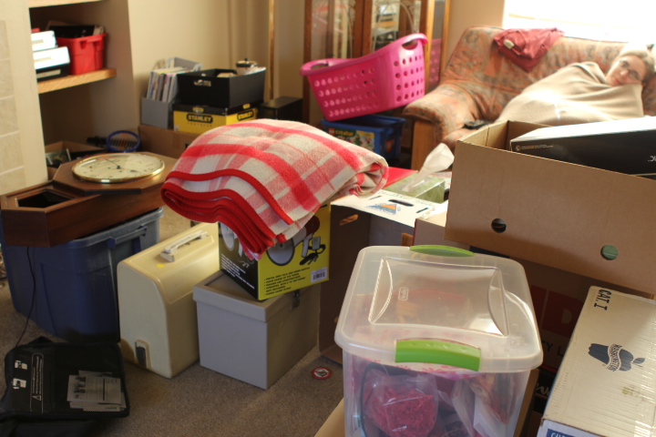 Believe it or not, this room looks better than it did a few days ago, when it was filled with these boxes and bookshelves and dressers.